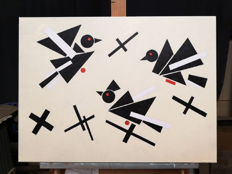 I increasingly think that this painting is not about Suprematism and not about birds. It is about the impossibility of carrying abstraction to its end. About how, at some point, form begins to resist purity and demands presence. Demands noise, trace, gaze.